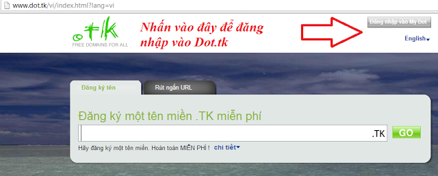 Bước 1: Đầu tiên các bạn truy cập vào địa chỉ: http://www.dot.tk/ Màn hình xuất hiện như thế này, các kích vào phần đăng nhập.